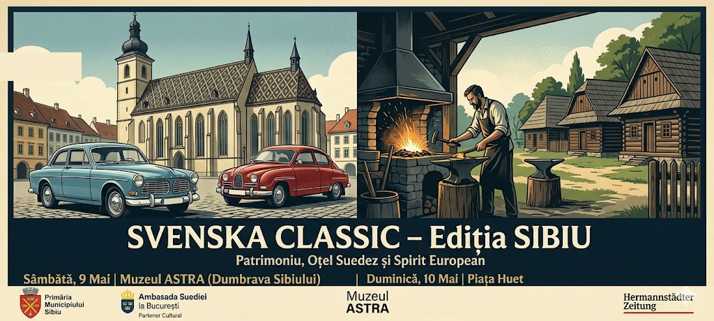„Oțel Suedez în Dumbrava Sibiului” – expoziție statică, demonstrații la atelierul de fierărie și interacțiune cu publicul într-un cadru de patrimoniu tradițional.